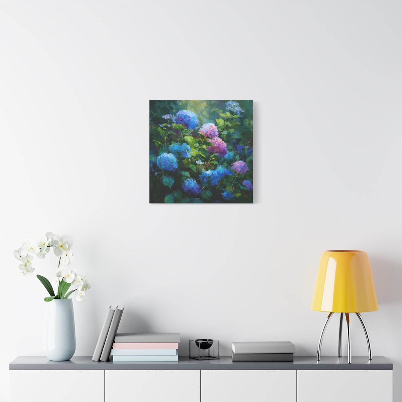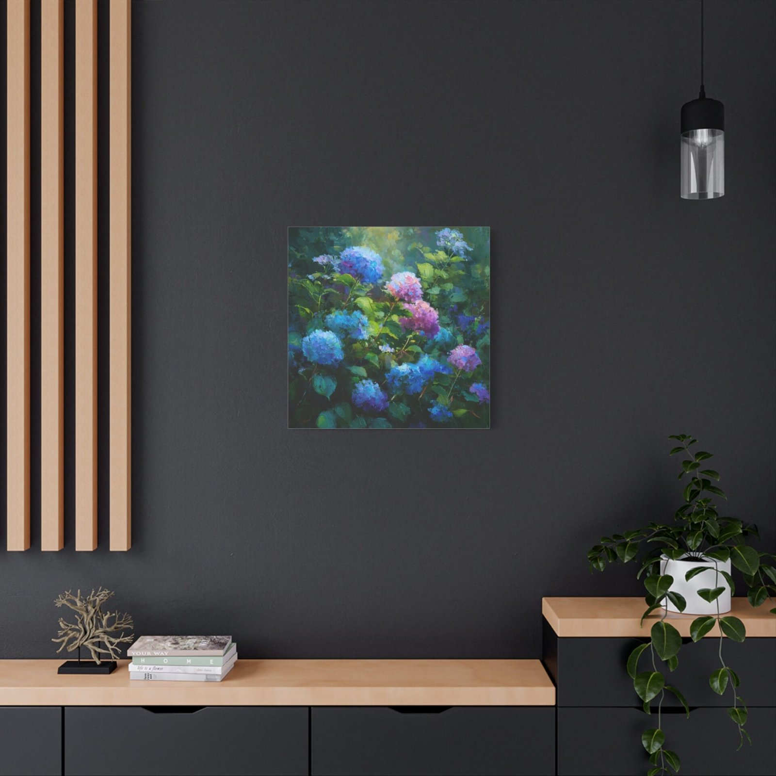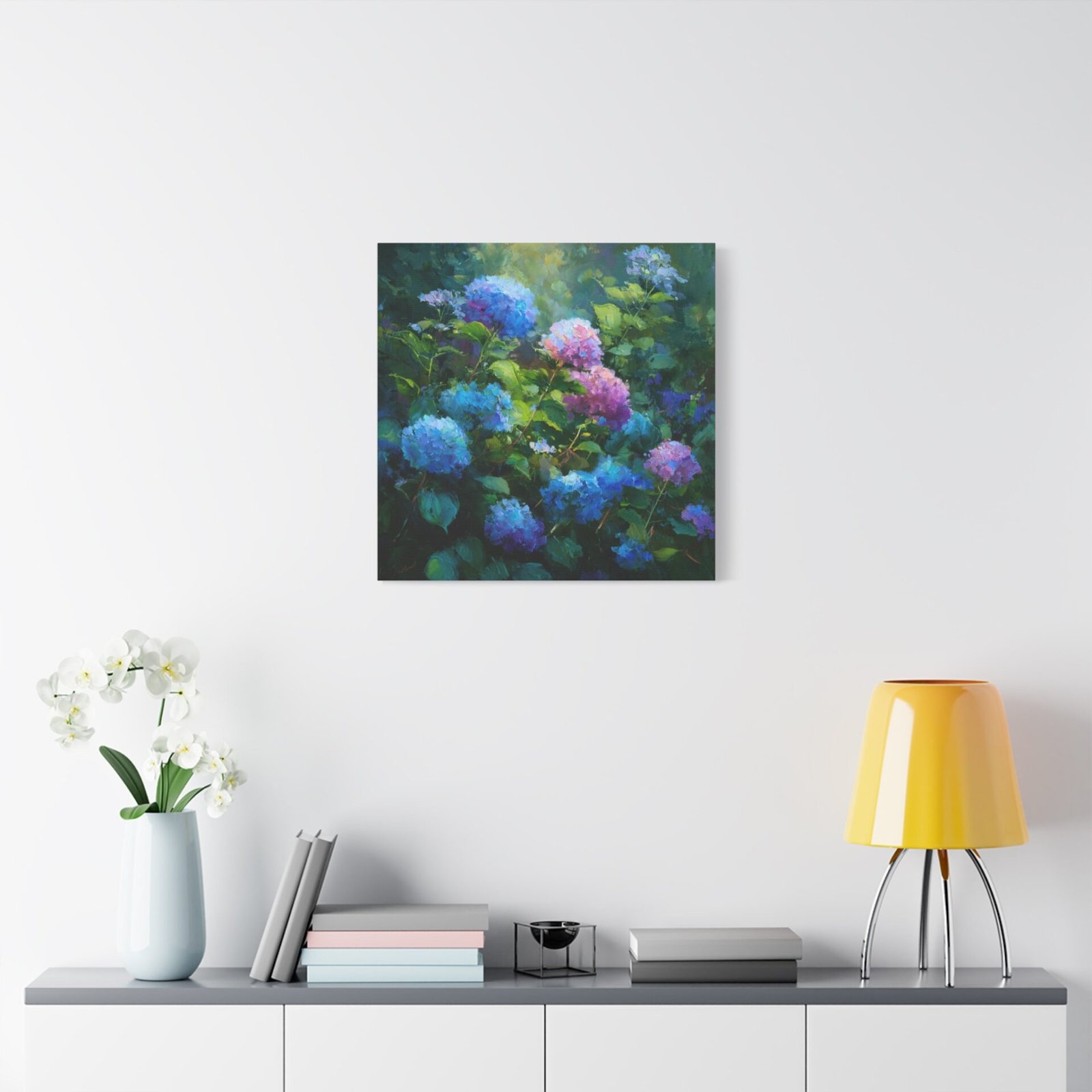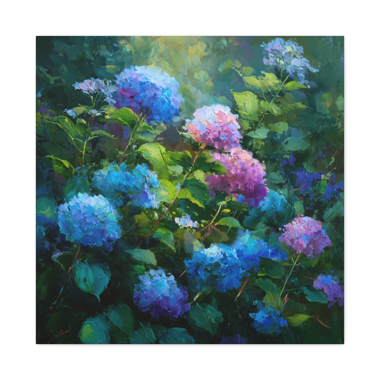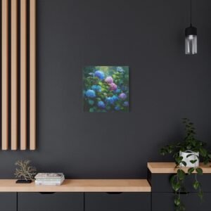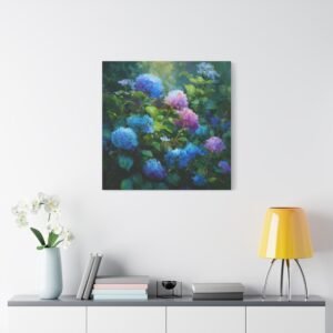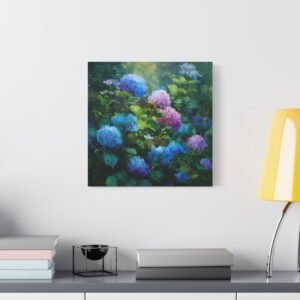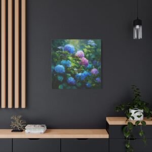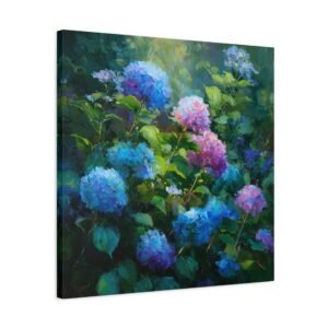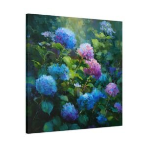 Plongez dans un jardin en fleurs avec ce Tableau Peinture Hortensia. Il s’agit d’une peinture à l’huile luxuriante représentant des hortensias en pleine floraison, avec des grappes de fleurs délicates aux teintes de bleu profond, de rose doux et de blanc crème. Le feuillage vert riche crée des ombres naturelles, peintes dans un style impressionniste avec des coups de pinceau visibles et une application de peinture texturée. La lumière du soleil tachetée filtre à travers les feuilles du jardin, offrant une composition romantique et classique avec une profondeur et une perspective atmosphérique. La palette de couleurs est vibrante mais harmonieuse, ajoutant une touche d’élégance à votre décoration intérieure.