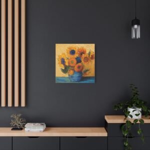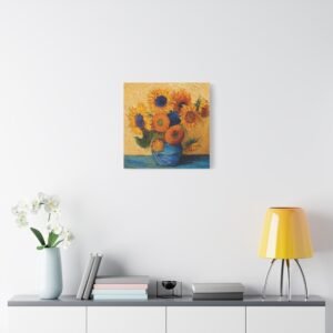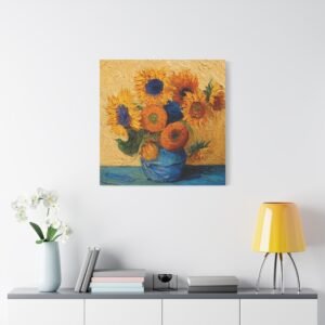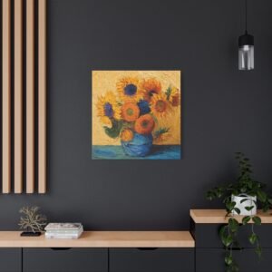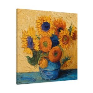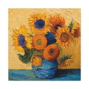 Ce Tableau Peinture Huile Les Tournesols est une représentation classique des tournesols dans le style de Van Gogh. Les coups de pinceau épais en impasto créent une texture riche, mettant en valeur des jaunes et des oranges vibrants avec de profonds accents bleus. L’application dynamique de la peinture révèle l’énergie émotionnelle de l’artiste. Un vase rustique tient les fleurs, sur un fond doré et chaleureux avec une texture de toile visible. La technique post-impressionniste est mise en valeur par des contrastes de couleurs audacieux et un travail de pinceau expressif.