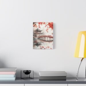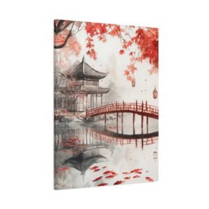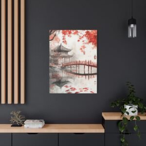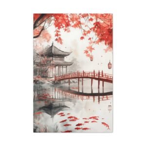 Les coups de pinceau sumi-e et la brume délicate confèrent à cette œuvre une profondeur méditative unique. Installez ce tableau dans votre salon ou votre espace de détente pour créer un havre de paix instantané. Les lanternes flottantes et le pont traditionnel en bois ajoutent une touche poétique qui invite à la contemplation.