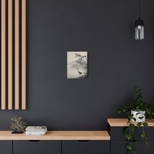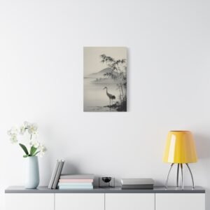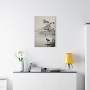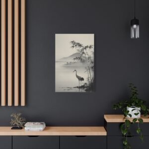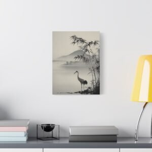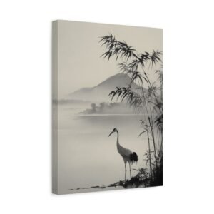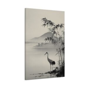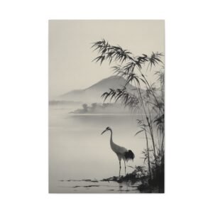Découvrez le charme apaisant de notre tableau peinture sumi-e. Cette œuvre d’art dépeint un crane solitaire au bord d’un lac brumeux, avec des tiges de bambou délicates qui se balancent au premier plan. Les montagnes lointaines sont à peine visibles à travers des lavis doux et gris. La composition minimaliste et les pinceaux fluides créent une atmosphère contemplative et paisible. L’encre noire sur le papier de riz blanc évoque l’esthétique japonaise traditionnelle, avec un espace négatif abondant et des gradations subtiles du noir profond au gris pâle. Ce tableau est idéal pour créer une ambiance zen dans votre salon ou votre bureau.