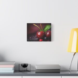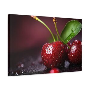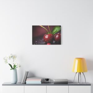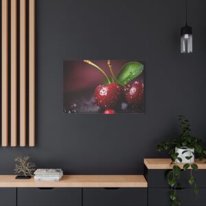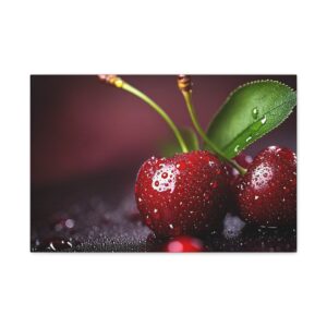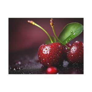 Plongez dans l’univers gourmand et artistique de cette photographie saisissante qui sublime la cerise dans ses moindres détails. Les gouttelettes d’eau cristallines sur la peau luisante du fruit créent un effet spectaculaire qui captivera instantanément le regard de vos convives.