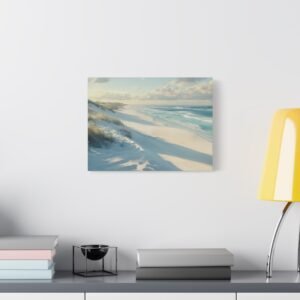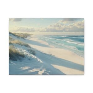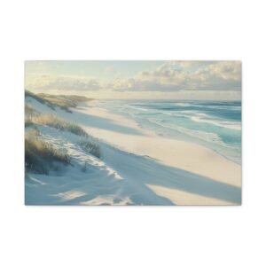 Évadez-vous instantanément vers un havre de paix avec ce tableau saisissant de réalisme. Le sable immaculé, sculpté par la brise marine, s’étend à perte de vue tandis que les vagues turquoise viennent délicatement lécher le rivage, créant un spectacle naturel hypnotisant.