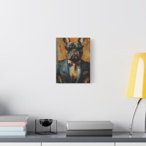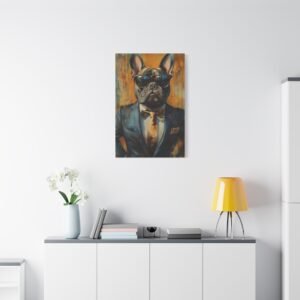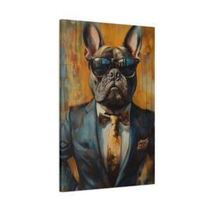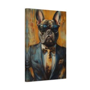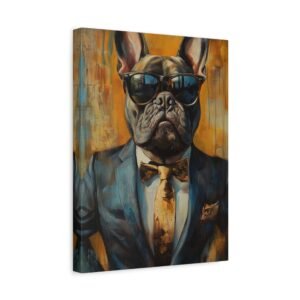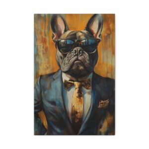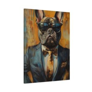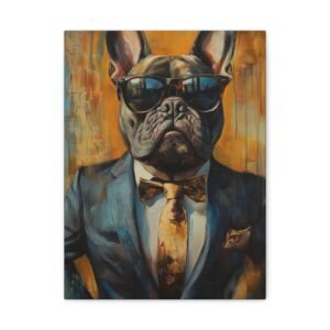 Découvrez notre tableau portrait de chien habillé, une pièce unique qui allie humour et sophistication. Cette élégante peinture à l’huile d’un bulldog fashion met en scène un canidé vêtu d’un costume de designer, arborant une cravate en soie et des lunettes de soleil stylées. Le fond urbain contemporain ajoute une touche de modernité à cette œuvre d’art surprenante.