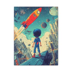 La composition action-packed mêlant fusées spatiales, dinosaures volants et robots captivera instantanément votre enfant. Les lignes dynamiques et le style anime japonais apportent un mouvement saisissant, tandis que le paysage urbain futuriste parsemé d’étoiles et de planètes ouvre la porte vers des aventures infinies.