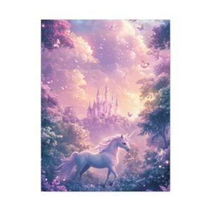 La licorne magique évoluant dans une forêt enchantée, entourée de papillons dansants et d’étoiles scintillantes, insuffle une ambiance merveilleuse à la chambre. Les petites créatures adorables et le château de princesse se détachant sur des nuages roses ajoutent une touche de douceur particulièrement adaptée à l’univers des petites filles.