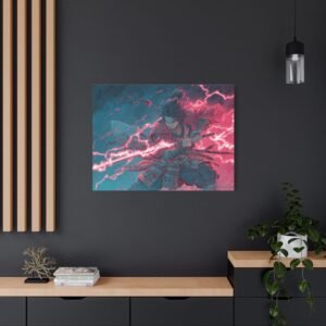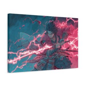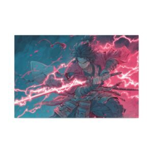 Plongez au cœur de l’action avec ce tableau samouraï katana. Inspiré de l’esthétique du manga et de l’anime Demon Slayer, ce tableau représente un puissant guerrier samouraï, katana à la main, dans une pose dynamique. Le katana dégage des effets de lueur, ajoutant une touche de mystère et de puissance à l’œuvre. Le samouraï porte une armure traditionnelle aux détails complexes, et un haori aux couleurs vibrantes, avec des accents de bleu électrique et de rouge écarlate. L’éclairage dramatique et les effets de particules renforcent l’intensité de l’expression du samouraï, lui donnant une allure à la fois féroce et majestueuse.