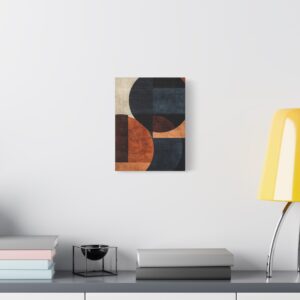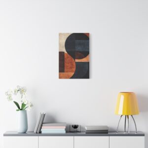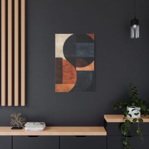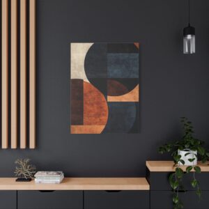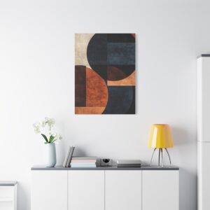 La palette sophistiquée associant notes chaudes et froides fait de cette œuvre un élément décoratif polyvalent. Les cercles et rectangles superposés sur un fond texturé apportent une profondeur visuelle saisissante à votre intérieur.