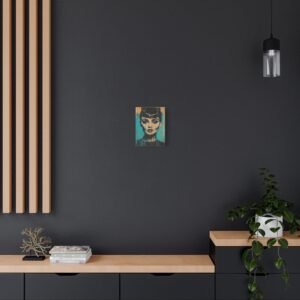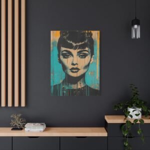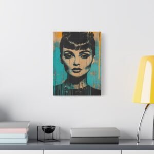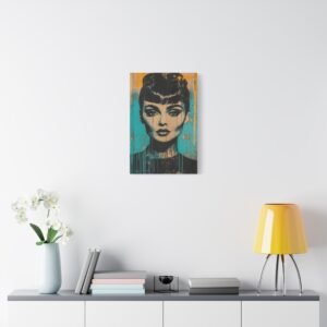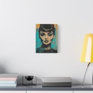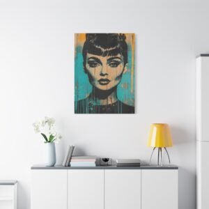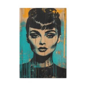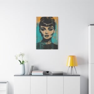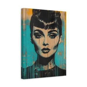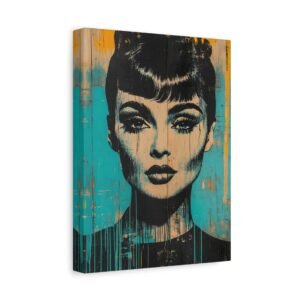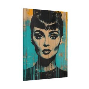 Les éclaboussures abstraites en turquoise et or dansent autour de l’iconique silhouette « Breakfast at Tiffany », tandis que la technique de peinture dégoulinante ajoute une dimension rebelle à cette œuvre unique. Les éléments géométriques et les textures graffiti créent un contraste saisissant avec l’élégance intemporelle de l’actrice.