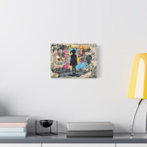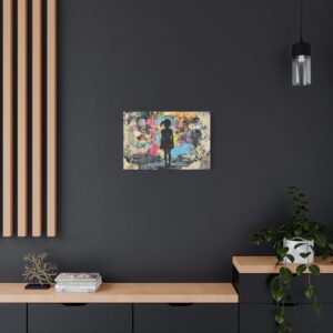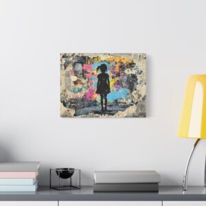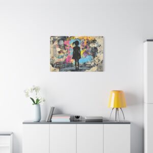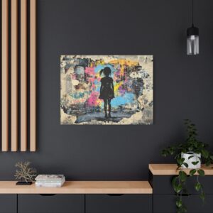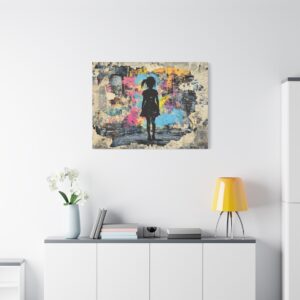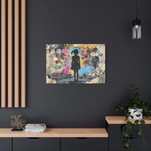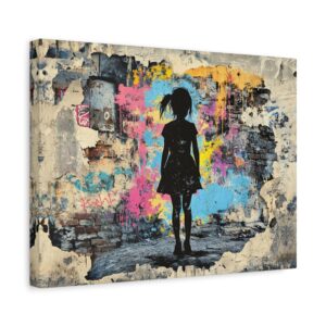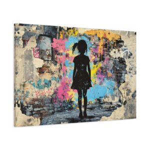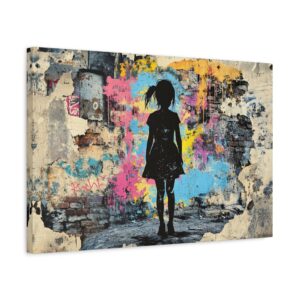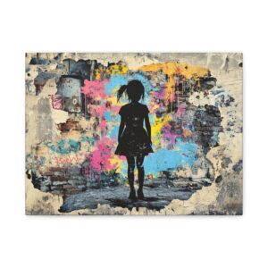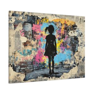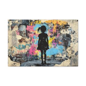 Explosez les codes décoratifs avec cette œuvre emblématique du street art où une fillette au pochoir déchire la réalité pour révéler un univers électrique. Les éclaboussures de peinture néon et les graffitis chaotiques créent une rupture saisissante avec le monochrome, signature du maître du street art.