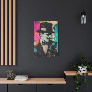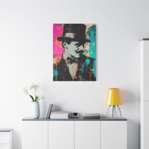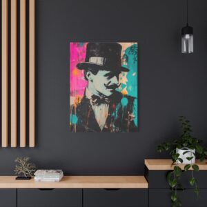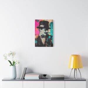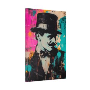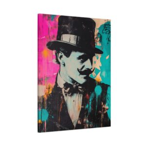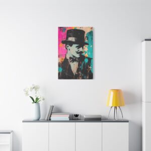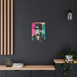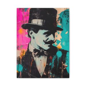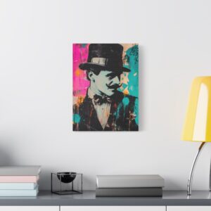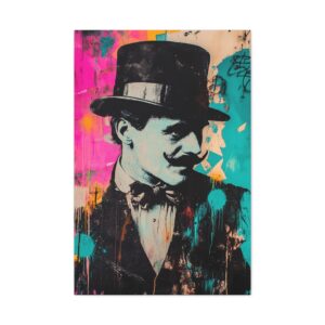 Laissez-vous captiver par cette fusion explosive entre le charme vintage de Charlie Chaplin et l’énergie brute du street art contemporain. Le profil emblématique au chapeau melon se détache magistralement sur un arrière-plan graffiti éclatant, où les tons néon roses et turquoise dansent avec audace.