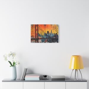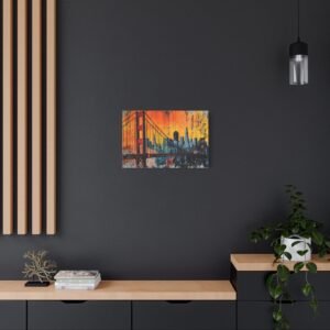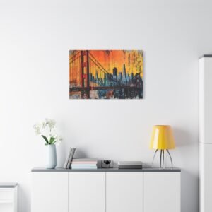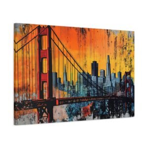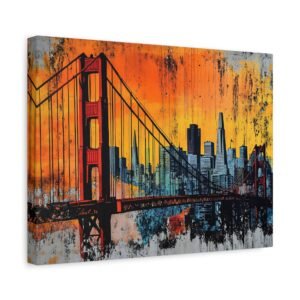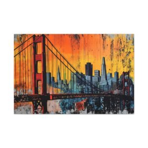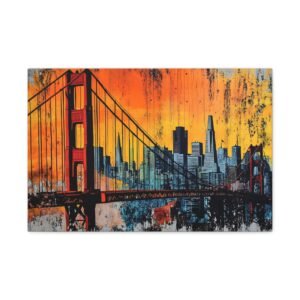 Embarquez pour la côte ouest avec ce tableau street art San Francisco qui capture l’âme vibrante de la ville. La silhouette emblématique du Golden Gate se découpe sur un *ciel urbain explosif*, où les teintes orangées du coucher de soleil californien se mêlent aux tons brumeux si caractéristiques de la baie.