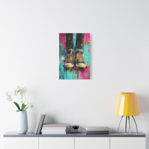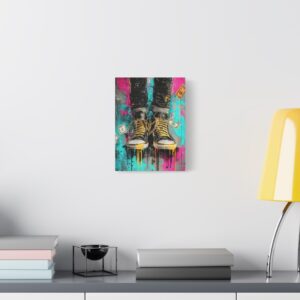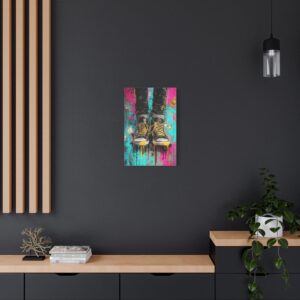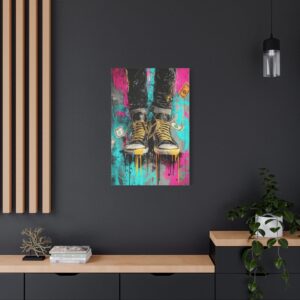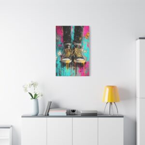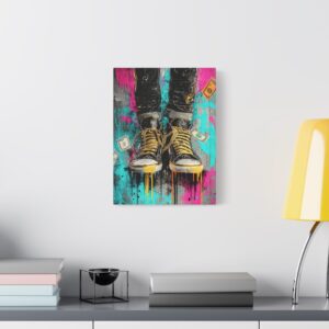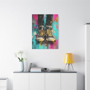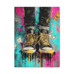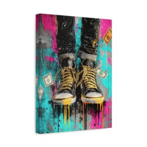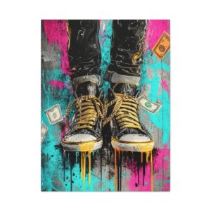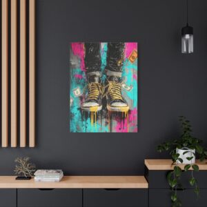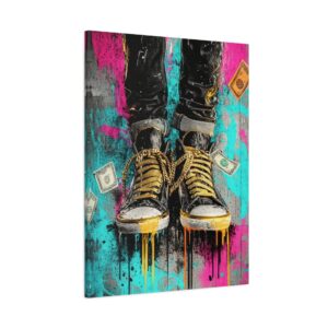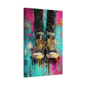 Immergez-vous dans cet univers street art explosif où des sneakers vintage s’entremêlent avec des détails de chaînes dorées. Les éclaboussures turquoise et rose vif contrastent avec le personnage central en noir et blanc, créant une composition urbaine électrisante.