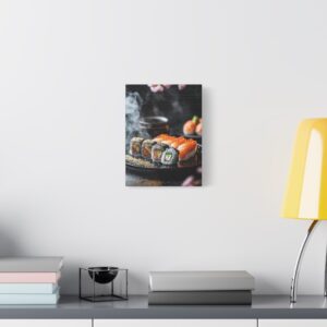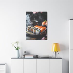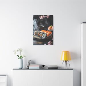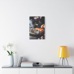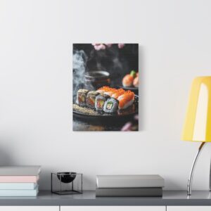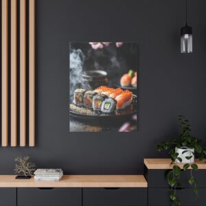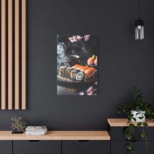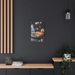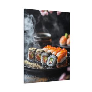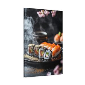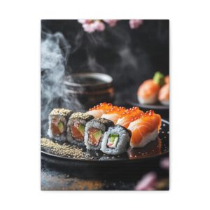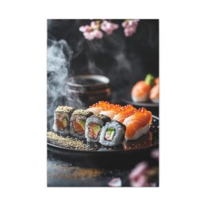Plongez dans l’élégance zen avec cette composition japonaise raffinée où les sushis deviennent de véritables œuvres d’art. Les pétales de sakura délicatement dispersés et les accents de feuilles d’or créent une atmosphère luxueuse qui transcende la simple représentation culinaire.