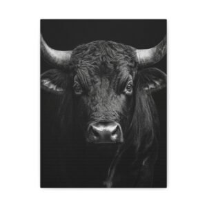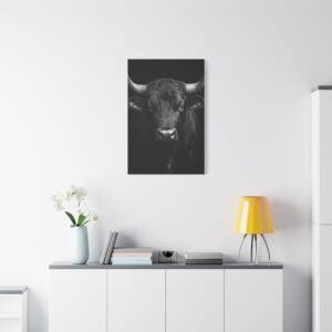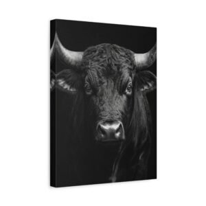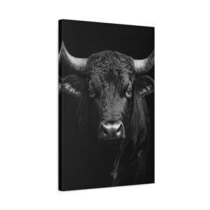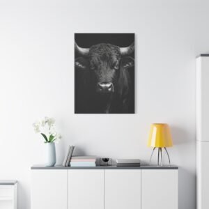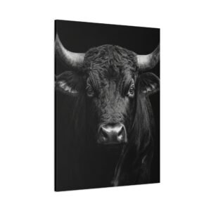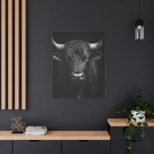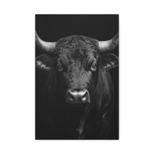 Insufflez une présence magistrale à votre intérieur avec ce portrait saisissant de taureau en noir et blanc. Capturé dans un style minimaliste, ce tableau dévoile la puissance brute et le charisme naturel de l’animal à travers des contrastes intenses et des ombres profondes.