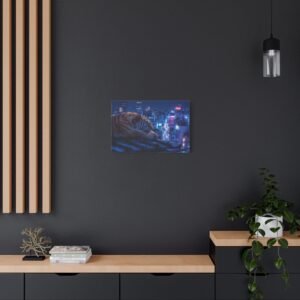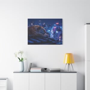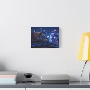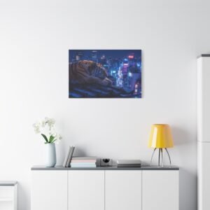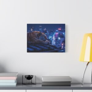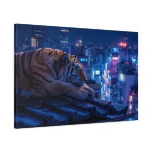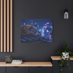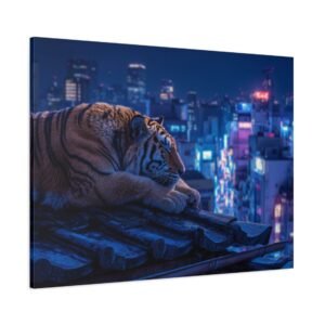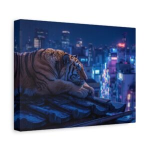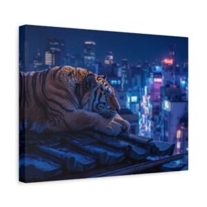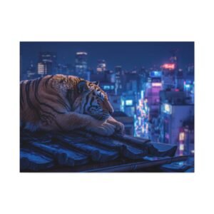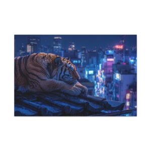 Immergez-vous dans une scène nocturne saisissante avec notre Tableau Tigre – Pause Sur un Toit de Tokyo. Ce tableau présente un tigre majestueux reposant sur des tuiles de toit traditionnelles japonaises, avec les lumières néon de la ville de Tokyo illuminant le paysage urbain en arrière-plan. Le contraste saisissant entre la jungle urbaine et la présence sereine de la faune sauvage crée une atmosphère cyberpunk captivante. L’éclairage dramatique des néons de la ville met en valeur l’architecture traditionnelle qui se mêle aux gratte-ciels modernes, offrant une composition cinématographique.