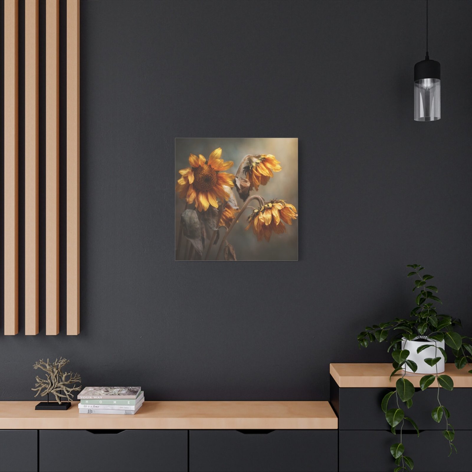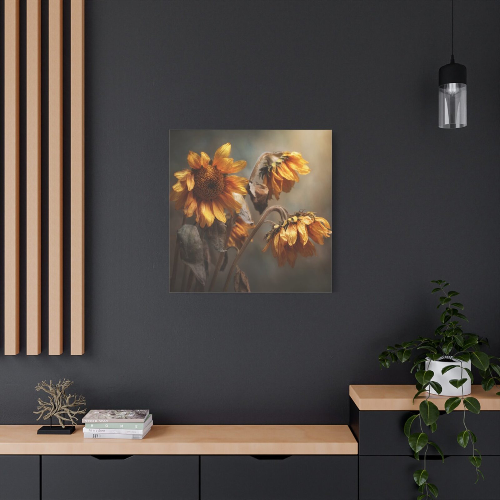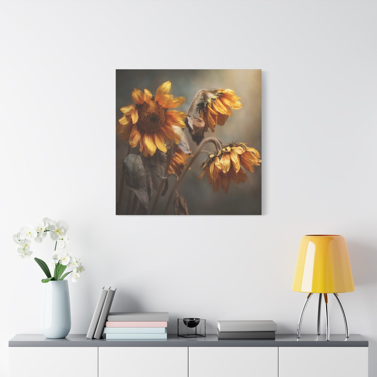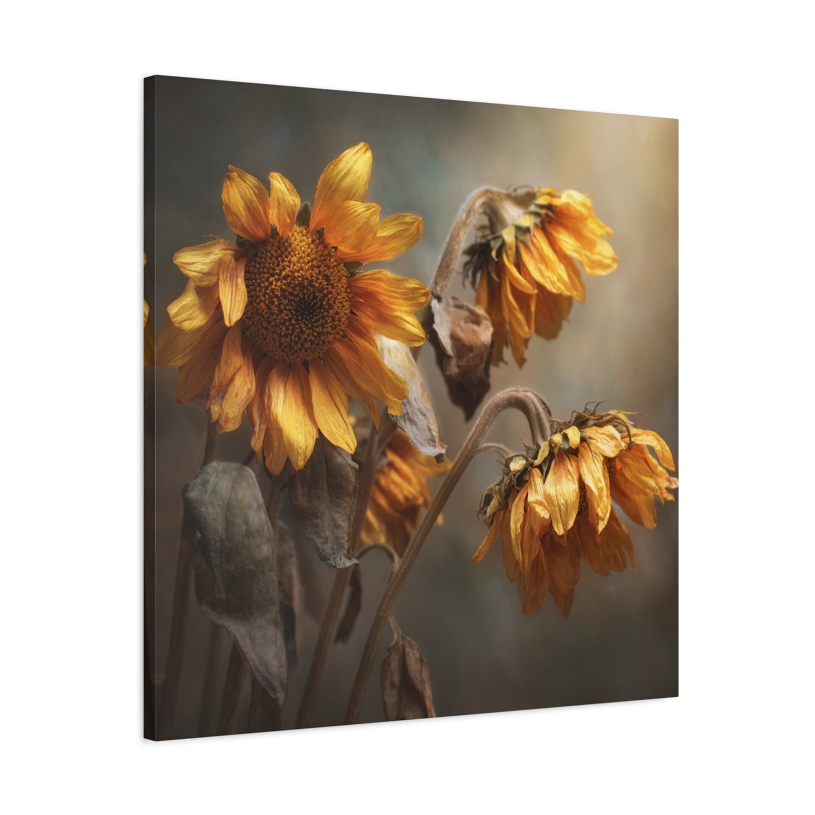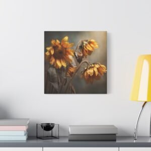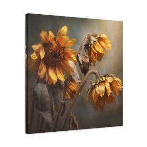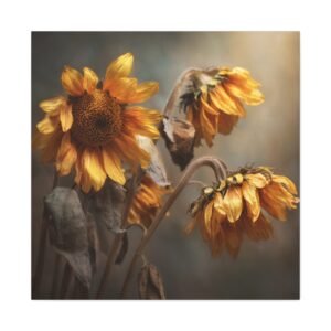 Découvrez notre Tableau Tournesol Fané, une photographie réaliste mélancolique de tournesols flétris en fin d’automne. Les pétales jaunes et bruns qui pendent, les tiges desséchées et les visages flétris tournés vers le bas créent une atmosphère de douce transition saisonnière. Les tons terreux et la lumière dorée qui filtre à travers le ciel couvert ajoutent une profondeur émotionnelle à cette œuvre. La photographie professionnelle capture les détails texturaux fins des fleurs qui s’estompent, créant un effet de focus doux en arrière-plan.