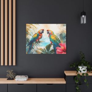 Transportez-vous instantanément sous les tropiques avec cette aquarelle vibrante mettant en scène deux majestueux aras parmi une végétation luxuriante. Les teintes turquoise de l’océan et les hibiscus éclatants créent une symphonie de couleurs dignes d’un paradis tropical.