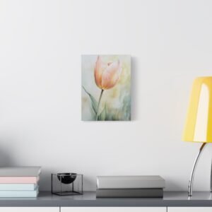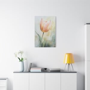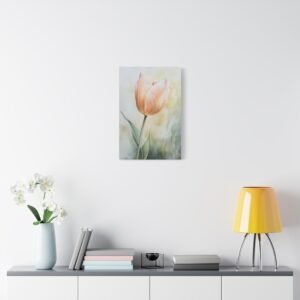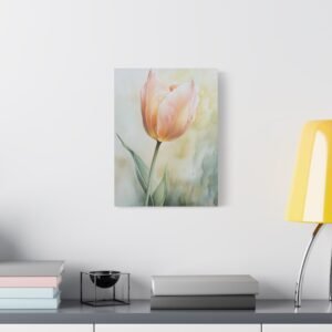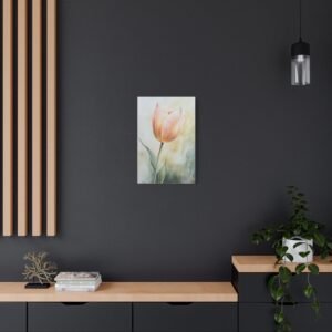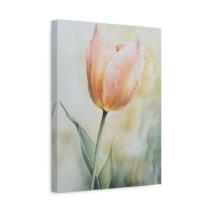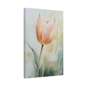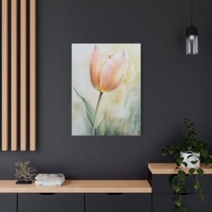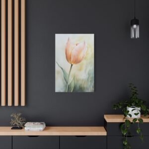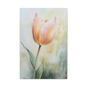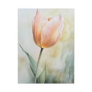 Découvrez la grâce pure de cette tulipe en aquarelle, capturée dans la douce lumière du matin. Les pétales translucides, ornés de gouttelettes de rosée scintillantes, créent une composition minimaliste d’une rare élégance, où chaque coup de pinceau raconte la délicatesse du printemps.