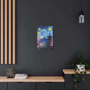 Cette réinterprétation unique marie la palette caractéristique de Van Gogh – bleus profonds, jaunes éclatants et roses intenses – avec l’iconographie japonaise traditionnelle. La silhouette de la pagode ajoute une touche d’authenticité orientale à cette composition vibrante. Parfait pour un salon artistique ou un espace de vie éclectique.