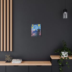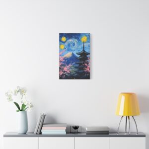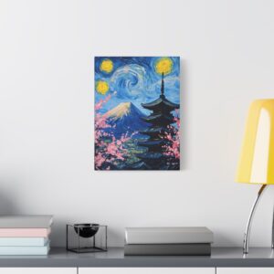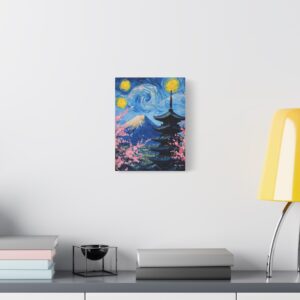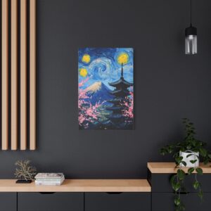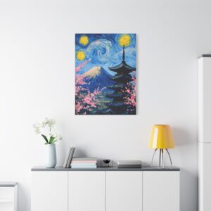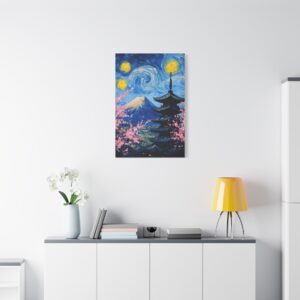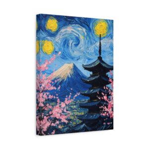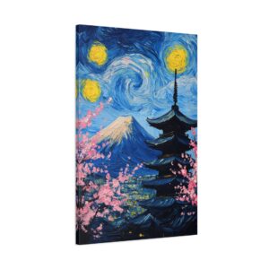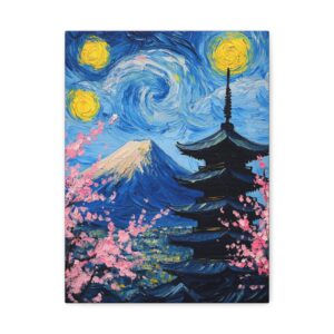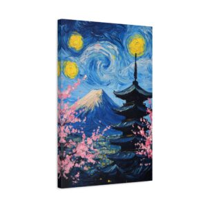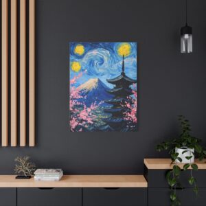 Explorez cette fusion artistique exceptionnelle où le style tourbillonnant de Van Gogh rencontre la grâce japonaise. Les cerisiers en fleurs s’animent sous des coups de pinceau expressifs, tandis que le Mont Fuji majestueux se dresse sous un ciel turbulent parsemé d’étoiles scintillantes.