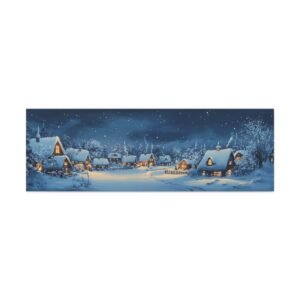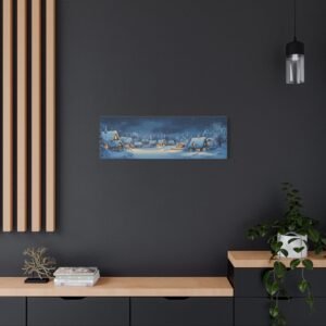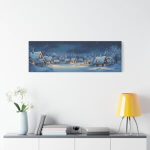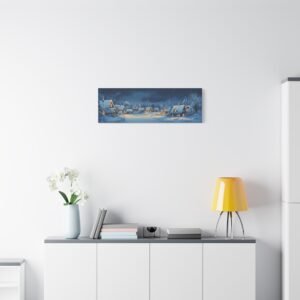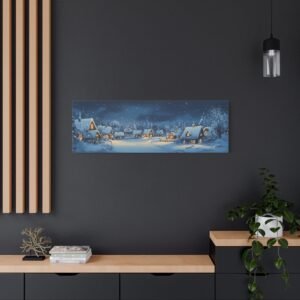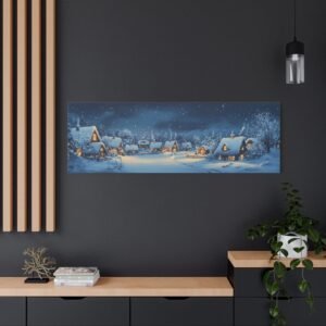 Les lueurs douces qui émanent des maisons créent une harmonie visuelle apaisante, tandis que les touches de gouache apportent une texture délicate qui évoque les traditions artistiques nordiques. Cette composition panoramique transforme instantanément votre espace en un havre de paix hivernal empreint de nostalgie.