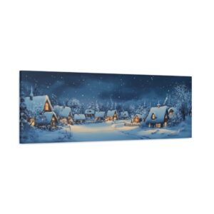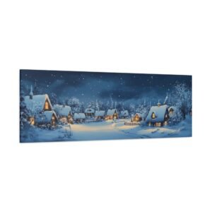 Plongez dans l’atmosphère enchanteresse et chaleureuse de ce village nordique enneigé, où chaque fenêtre illuminée raconte une histoire de douceur et de réconfort. Cette œuvre panoramique, réalisée dans un style folk art authentique, capture l’essence même du hygge scandinave.