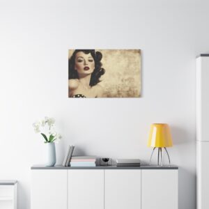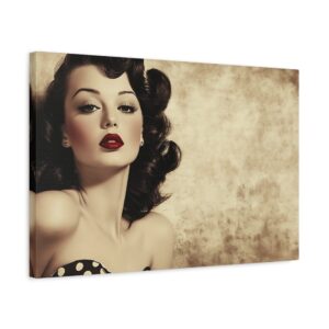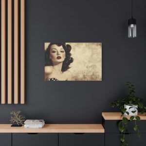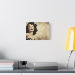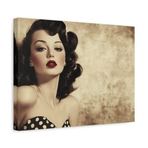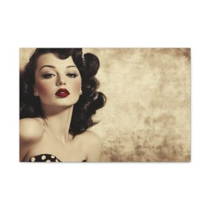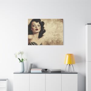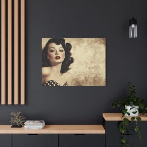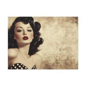Cette œuvre d’art rétro respire l’authenticité avec ses couleurs vibrantes et ses détails charmants : robe à pois, rouge à lèvres écarlate et expression espiègle. La finition aspect peint à la main ajoute une touche de nostalgie qui transporte instantanément dans l’ambiance des publicités vintage.
