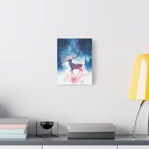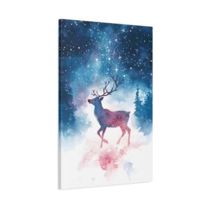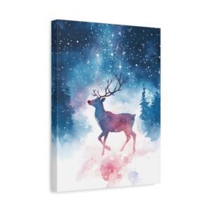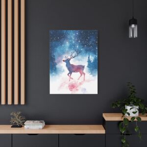 Laissez-vous transporter par la magie hivernale de cette aquarelle éthérée mettant en scène un cerf traversant un ciel étoilé. Les teintes douces et la technique délicate de l’aquarelle créent une atmosphère onirique qui sublime instantanément votre espace de vie.