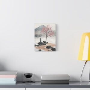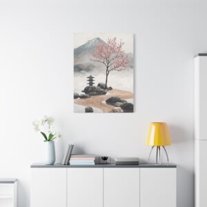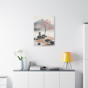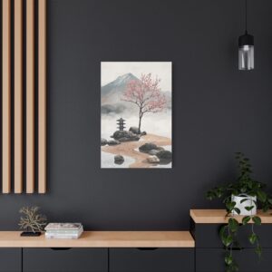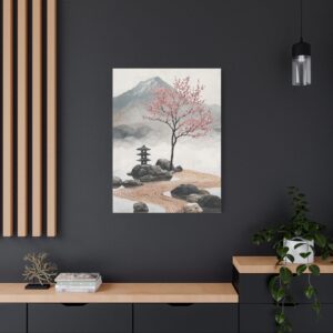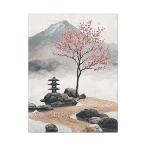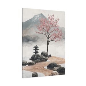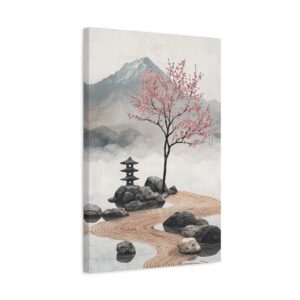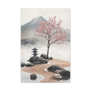 Immergez-vous dans la quiétude de ce jardin zen japonais où les motifs de sable ratissé dansent autour d’une composition minimaliste de pierres. Un cerisier en fleurs solitaire se détache sur la silhouette brumeuse des montagnes, créant une atmosphère de pure tranquillité.
