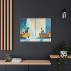 Inspirée par la légèreté des coups de pinceau aquarellés, cette œuvre dévoile des chats espiègles se prélassant parmi des éléments floraux abstraits. La composition onirique crée une atmosphère apaisante qui s’intégrera parfaitement dans votre intérieur, que ce soit dans un salon bohème, une chambre sereine ou un bureau créatif.