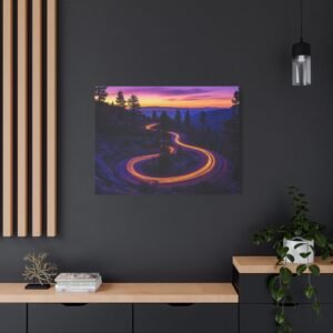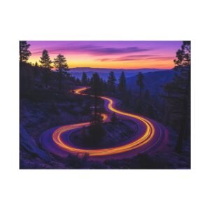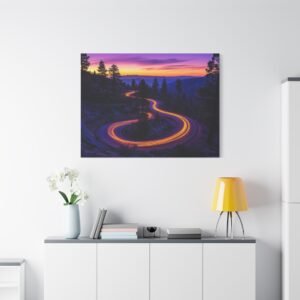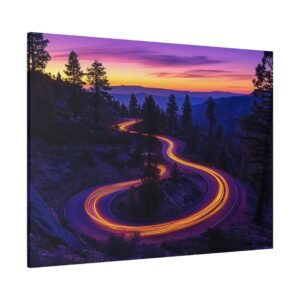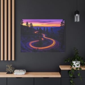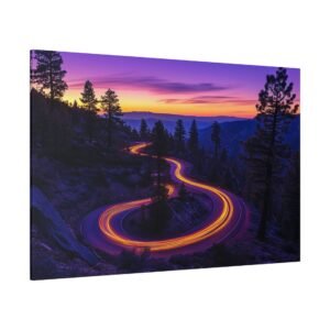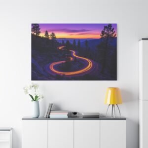 Les traînées lumineuses des phares, capturées en pose longue, dessinent des lignes dorées hypnotiques sur la route sinueuse, tandis que le ciel crépusculaire aux teintes violettes et bleues ajoute une dimension onirique à votre décor. Parfaitement adapté aux intérieurs modernes et minimalistes, ce tableau devient instantanément le point focal de votre pièce.