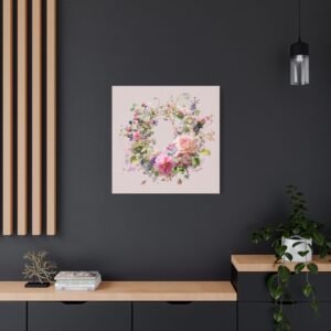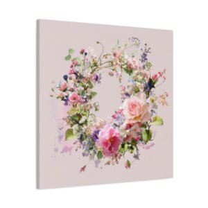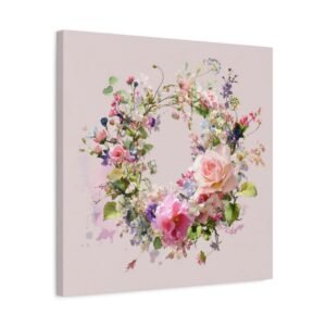 Découvrez notre Tableau Aquarelle Couronne de Fleurs, une composition féminine et élégante. Il présente une couronne de fleurs délicate, réalisée en style aquarelle avec une disposition circulaire de fleurs sauvages et de roses. Les couleurs pastel douces avec des fleurs roses, lavande et blanches ajoutent une touche romantique à cette oeuvre. Le feuillage et les tiges vertes douces, ainsi que les effets de diffusion de l’aquarelle, donnent une impression de légèreté et de douceur.