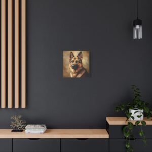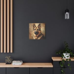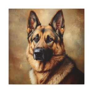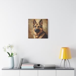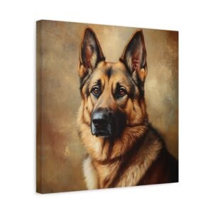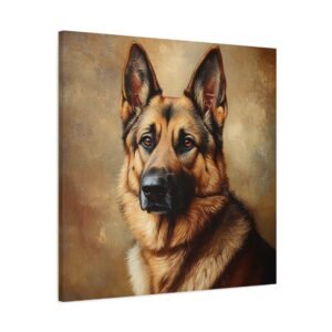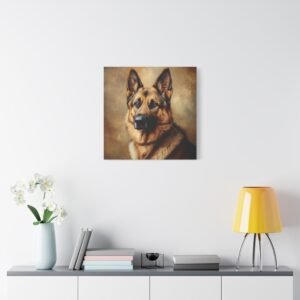 Ce portrait majestueux capture l’expression royale du Berger Allemand dans un style classique intemporel. L’arrière-plan atmosphérique et le fond crémeux mettent parfaitement en valeur le sujet principal. Cette œuvre trouvera naturellement sa place dans un salon élégant ou un bureau de caractère. Pour sublimer sa présence, privilégiez un mur aux teintes neutres qui fera ressortir les nuances chaleureuses de la composition.