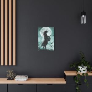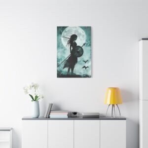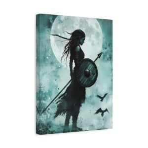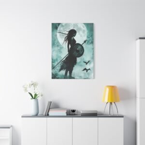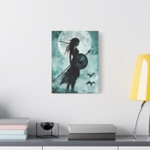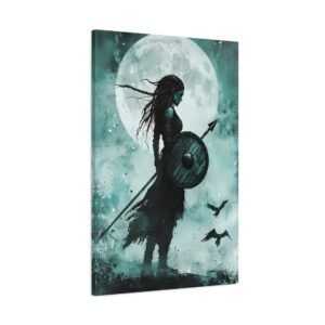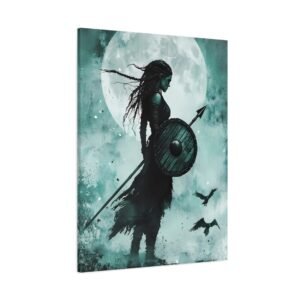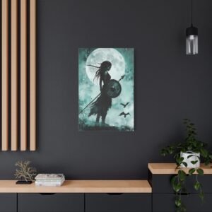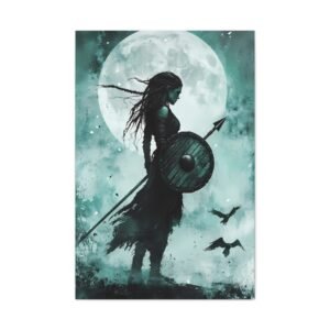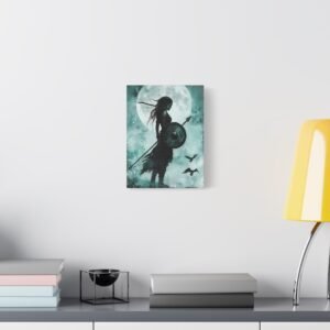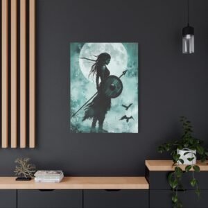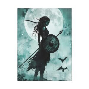 Laissez-vous transporter par la puissance mystique de cette guerrière viking majestueuse. La silhouette de cette shield-maiden se dresse fièrement, sa lance levée vers les aurores boréales dansantes, créant une atmosphère mystique unique. Les accents bleu glacier et argentés se marient parfaitement avec le contraste saisissant du noir et blanc, tandis que les symboles nordiques flottants évoquent la mythologie ancestrale.
