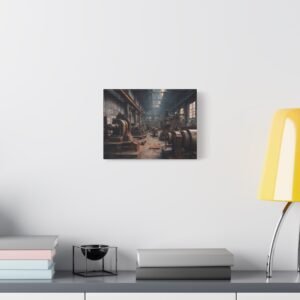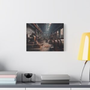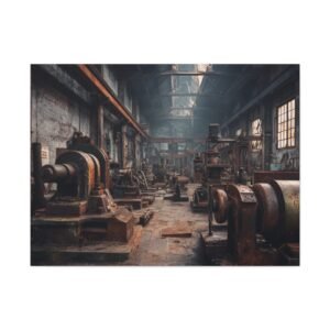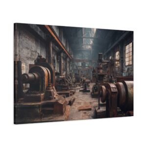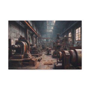 Plongez dans une atmosphère industrielle unique avec ce Tableau Industriel Métal & Rouille. Il dépeint une scène d’atelier métallique avec des machines rouillées, des poutres d’acier vieillies, des tuyaux de cuivre oxydés et des engrenages en fer corrodés. Le tableau capture l’essence d’une usine vintage, ses équipements couverts de patine, le tout éclairé de façon dramatique par la lumière qui se faufile à travers les fenêtres brisées. La texture de la rouille et de la corrosion ajoute une authenticité palpable à ce tableau au style steampunk.