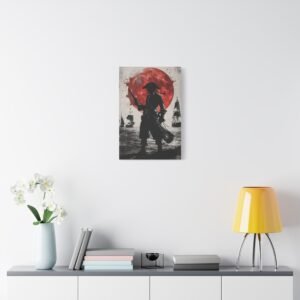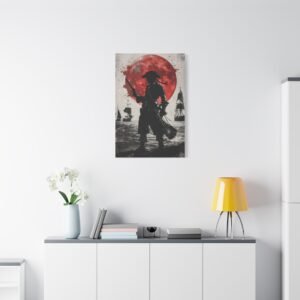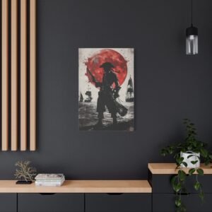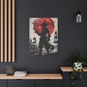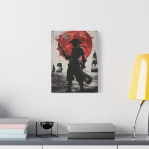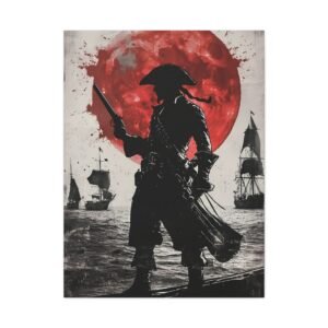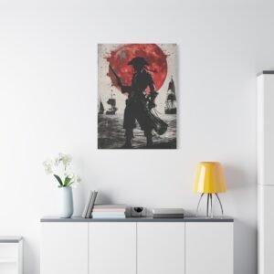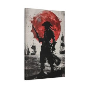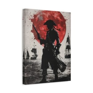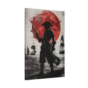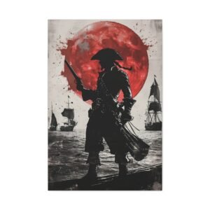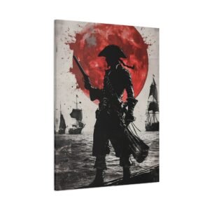 Plongez dans l’univers fascinant de la piraterie avec ce tableau d’art maritime saisissant. La silhouette mystérieuse du capitaine pirate se découpe sur un fond dramatique, où une lune cramoisie illumine une mer déchaînée. Les touches d’encre éclaboussées ajoutent une dimension artistique unique, tandis que le contraste noir et blanc sublimé par des accents pourpres crée une atmosphère à la fois puissante et énigmatique.