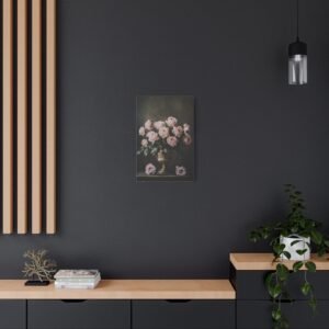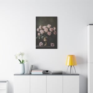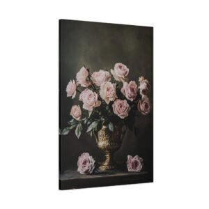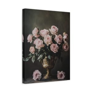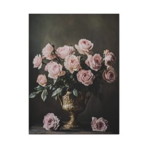 Plongez dans une atmosphère de raffinement intemporel avec cette composition classique envoûtante. Les roses aux teintes poudrées et rosées s’épanouissent avec grâce dans un vase doré ornementé, créant un dialogue saisissant entre lumière et ombre qui évoque la grandeur des maîtres anciens.