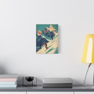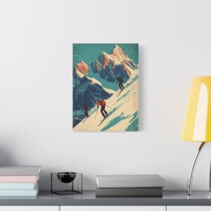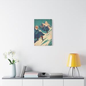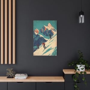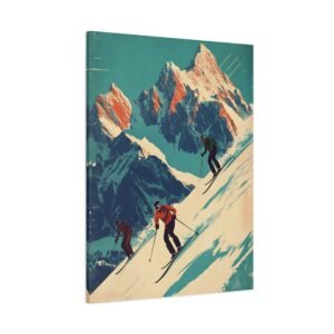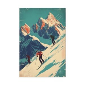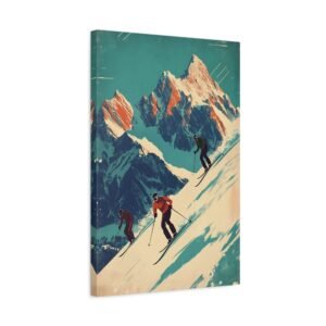 Transportez-vous dans l’âge d’or des sports d’hiver avec ce tableau vintage au style Art déco saisissant. Les silhouettes dynamiques des skieurs se découpent avec élégance sur un arrière-plan de sommets alpins enneigés, créant une composition graphique puissante typique des années 1930.