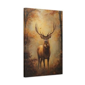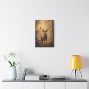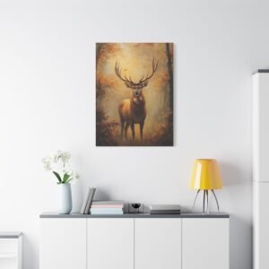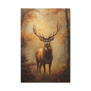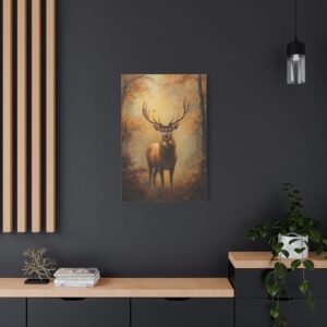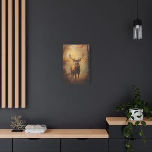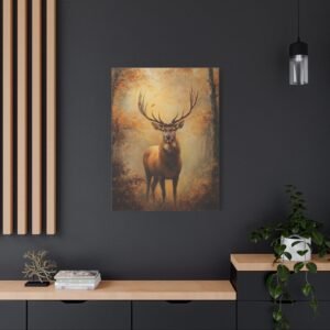 Ce tableau au format portrait 2:3 devient un point focal saisissant dans un intérieur raffiné. Les tons chauds et terreux, rehaussés par les bois dorés du cerf captant la lumière, s’harmonisent parfaitement avec des meubles en cuir patiné et des textiles aux teintes profondes. L’ambiance brumeuse apporte une dimension poétique à votre espace.